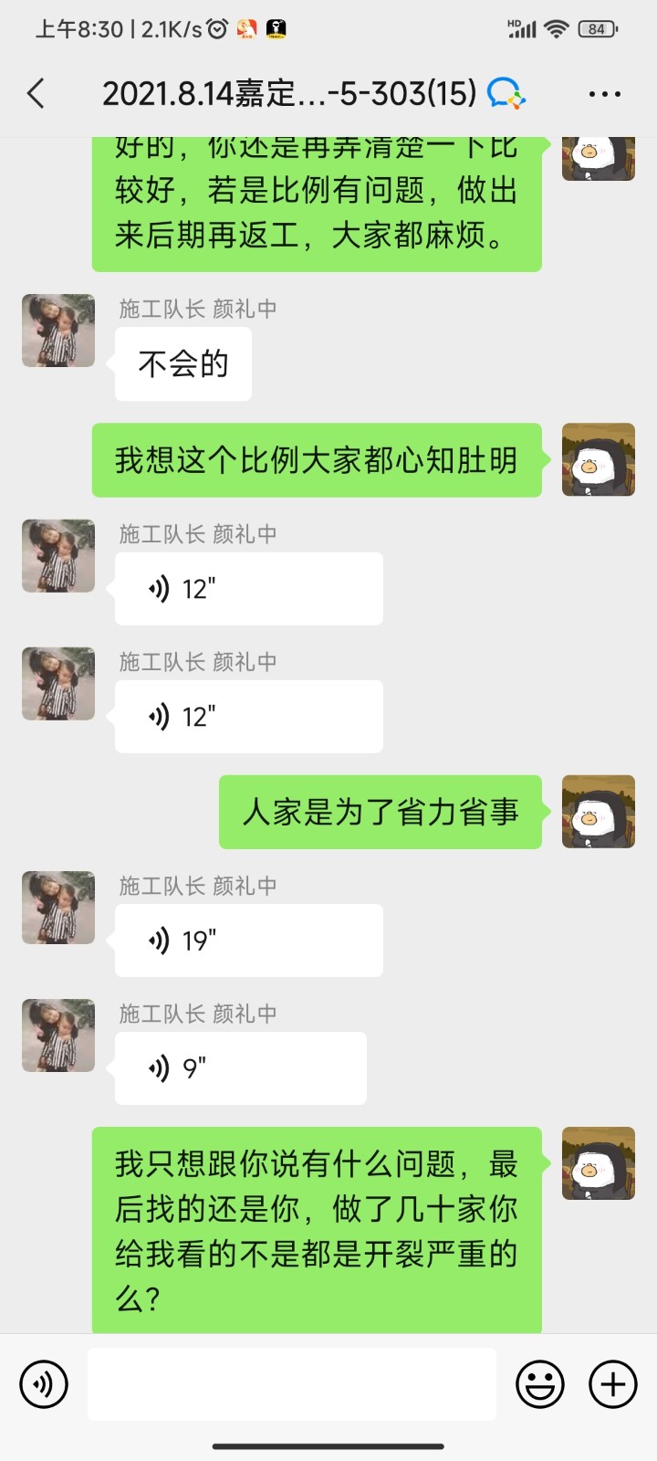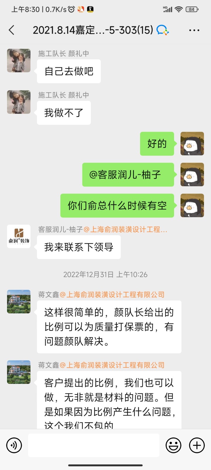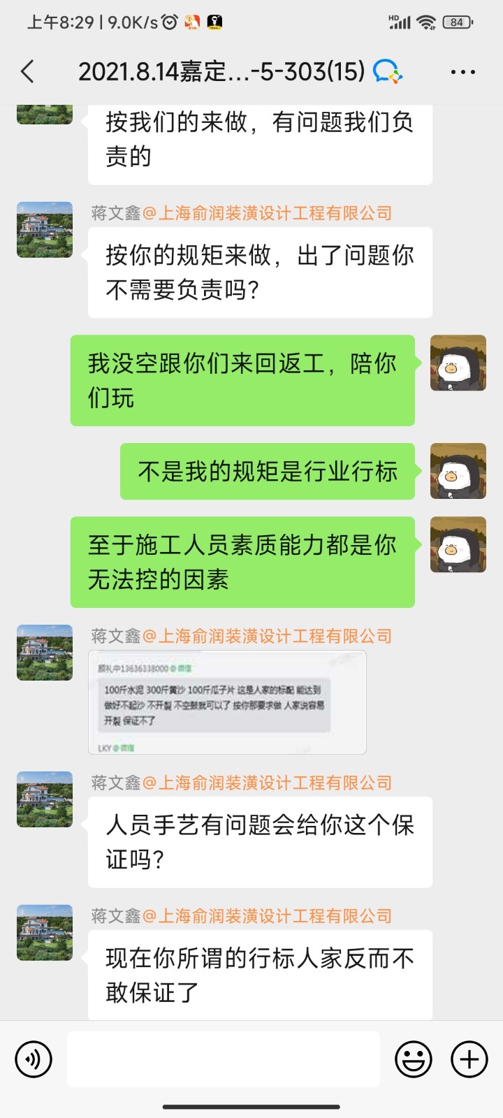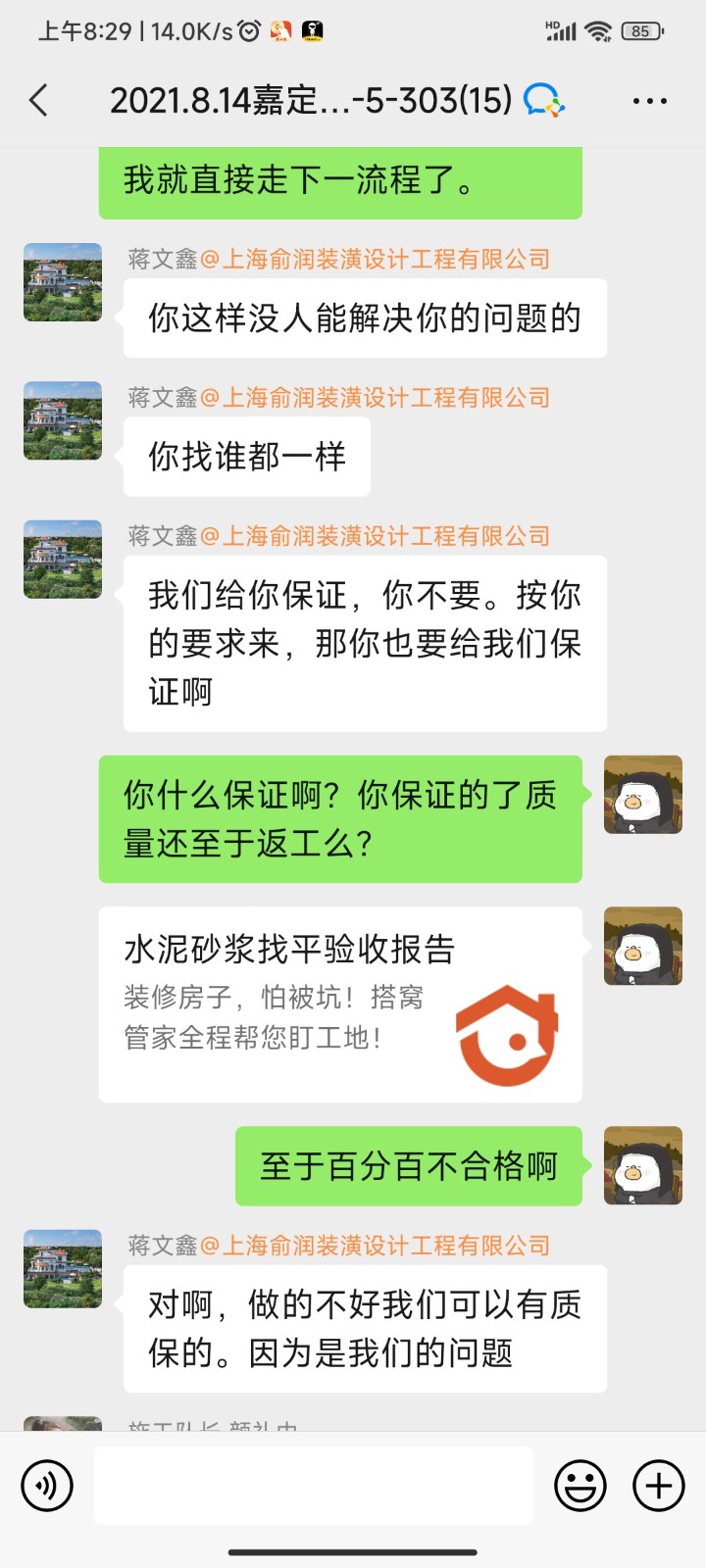 我在這里投訴上海俞潤建筑工程有限責(zé)任公司,現(xiàn)概述裝修中遇到的問題,2021年8月7日正式開工,合同約定工期為70個工作日,逾期至今。裝修期間出現(xiàn)各種施工問題并多次返工,諸如:開工時砌墻不放鋼筋、不肯掛鋼絲網(wǎng),新砌墻體歪斜后經(jīng)水泥砂漿、油漆階段多次修補,墻泥等厚度超10公分以上,衛(wèi)生間無止水梁,房間吊頂忘記做窗簾盒,返工后吊頂未打龍骨架,再返工,有的區(qū)域吊頂內(nèi)只放石膏板加一根2公分木方被發(fā)現(xiàn)無法承重后再多次返工,水電階段為多收增項款不按照定好的點位施工,后因保留了證據(jù)才未承擔(dān)多余部分。隊長帶領(lǐng)工人在家中多次隨意大小便,房間里各處都是,后來拿來了便攜馬桶,有甚者長達幾周不處理,排泄物一直存放于家中。許多地方未做到合同約定的施工保護,導(dǎo)致窗戶污損嚴重、滑道受損,瓷磚磕碰,止水帶尺寸錯誤,重做返工,一翻敲砸,修補后導(dǎo)致墻、地面瓷磚出現(xiàn)空鼓,水管管線走窗簾盒內(nèi)造成后期電動窗簾安裝問題。陽臺等處開橫槽超標(biāo),整個施工過程混亂,順序顛倒,哪個工人有空就先做什么,工人沒有時間,就停工。砌墻、水電、吊頂增項款均已支付。第一次做地坪驗收100%不合格,前期所做地坪全屋大面積起砂、空鼓、誤差超標(biāo),其中空鼓面積可達全屋60%以上,前后更換三家地板廠家不予鋪設(shè)地板。作為業(yè)主自己找監(jiān)理出了驗收報告,公司工程部經(jīng)理蔣文鑫,施工管家丑慶詞等人起初仍不愿至工地查看,各種微詞,后經(jīng)多次要求,終于移步工地,但仍說沒問題。這些都留有錄音證據(jù),最終強烈要求將不合格地面鏟除干凈,重新做地坪。第二次做地平仍全屋大面積空鼓開裂,誤差超標(biāo)。