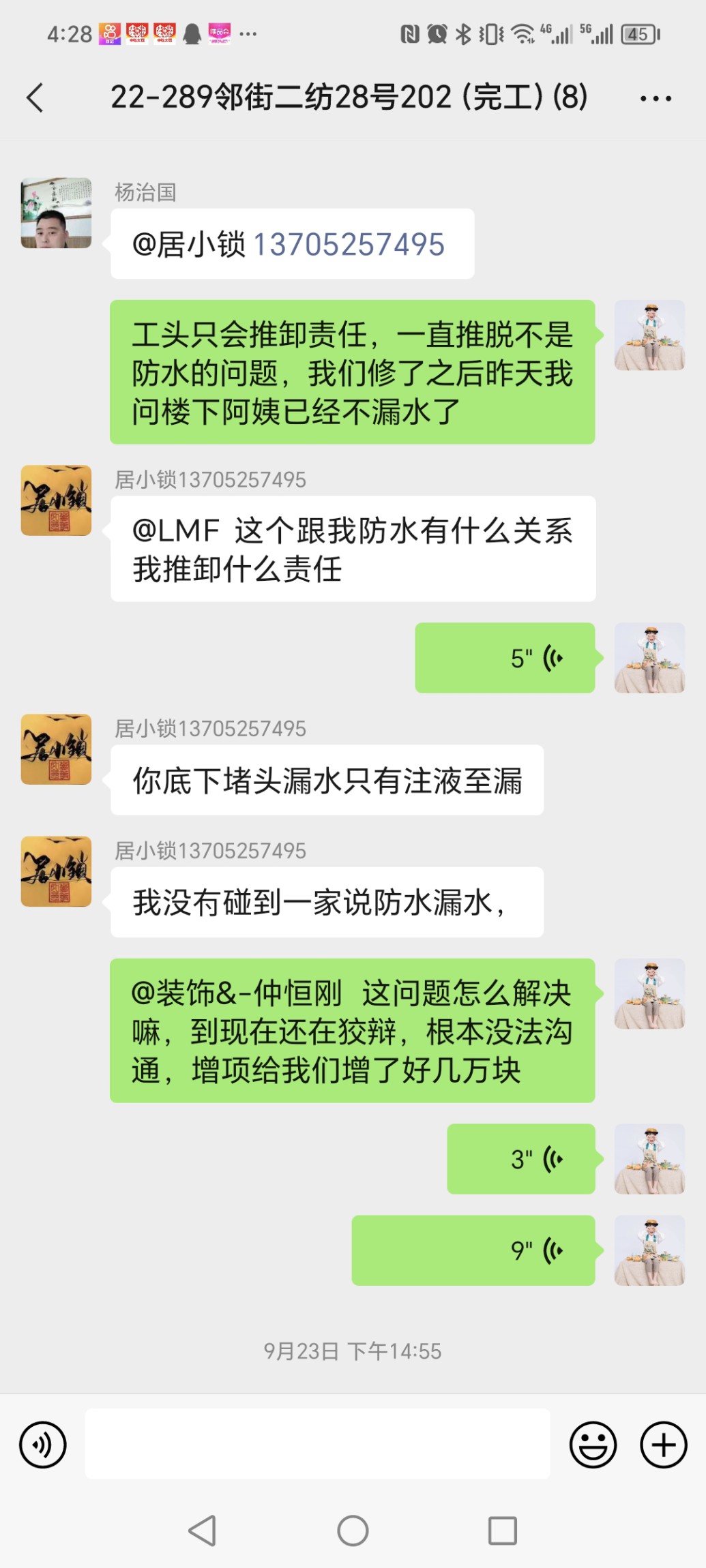 8月份入住不到半月下家找上來(lái)說(shuō)漏水至他家,多次聯(lián)系裝修公司一直拖延推脫責(zé)任,工頭一直躲著不出面解決,因影響他人生活我們自己找人地磚打洞修了防水,致電裝修公司老板提出維修費(fèi)用他們出,電話(huà)中也同意了。但真正要他們解決維修費(fèi)用時(shí),就一直推脫不解決問(wèn)題,跟他們反應(yīng)地板踩下去有噗噗噗聲音也不予回應(yīng)