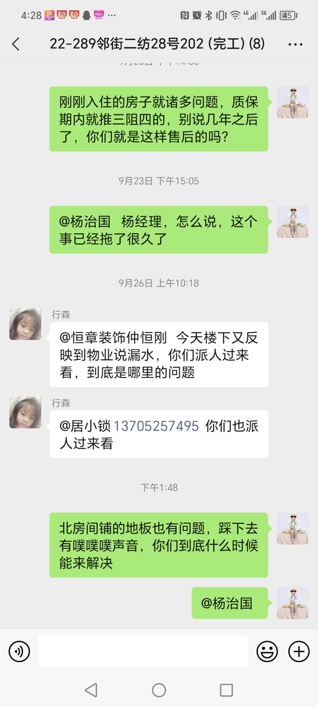 正在處理 裝修完工后多處出現(xiàn)問(wèn)題,瓷磚缺角、衛(wèi)生間積水不流到地漏、收了全屋防水的錢(qián)連衛(wèi)生間防水都沒(méi)做好、地板踩下去噗噗噗找裝修公司一直推脫不解決 - 上海恒章建筑裝飾有限公司