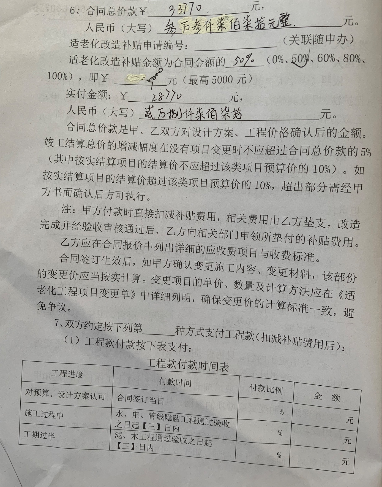 《上海市居家適老化改造合同》中關(guān)于裝修金額的內(nèi)頁(yè)。