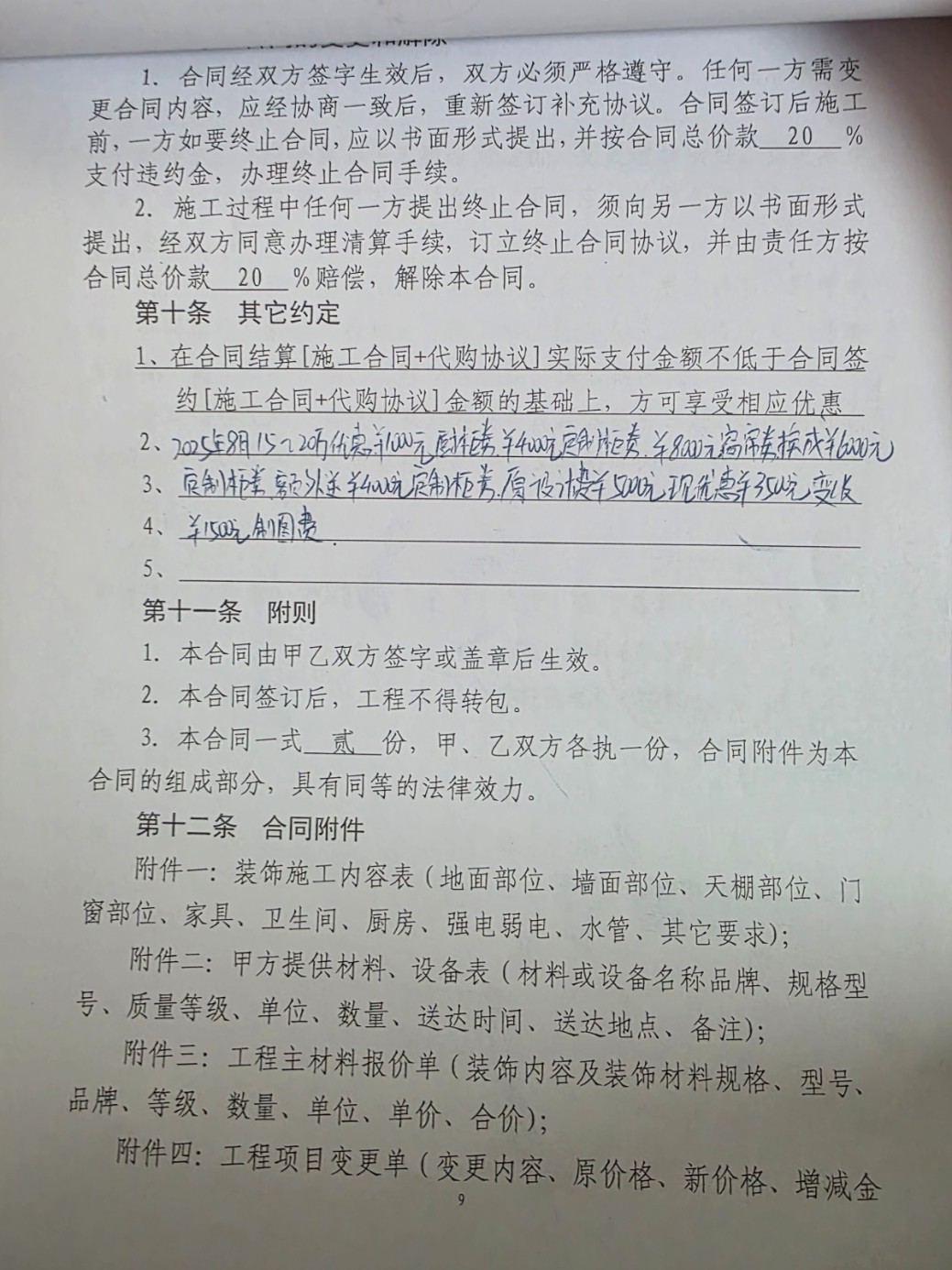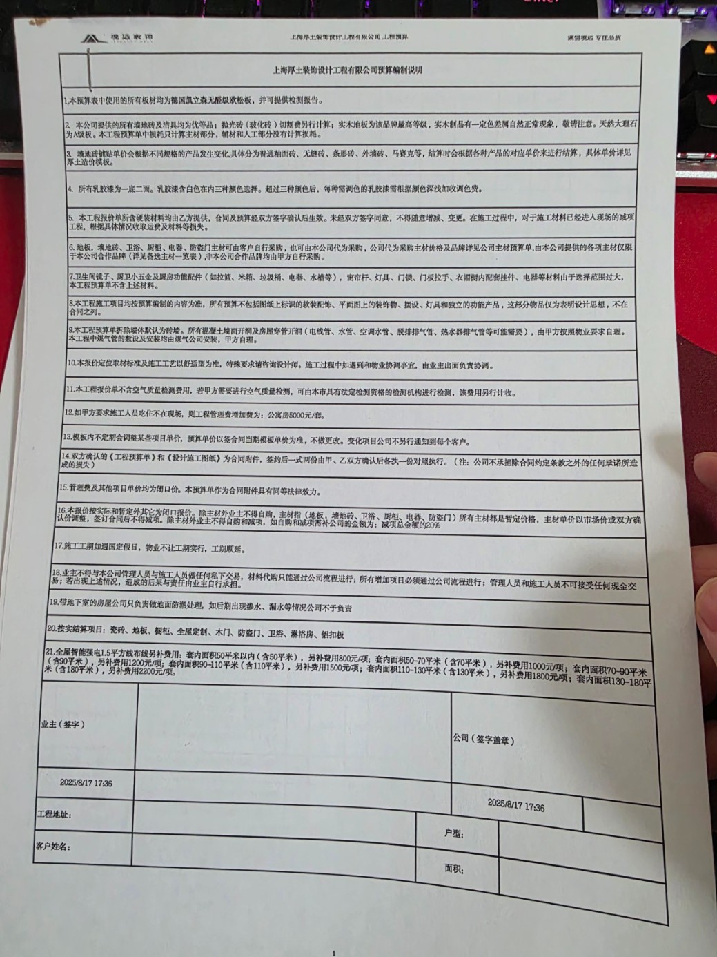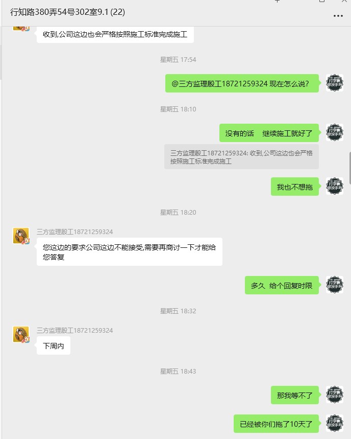 6.裝修合同用的住建局范本,但霸王條款都被藏在了預(yù)算清單里,若某單一項(xiàng)目在簽訂后取消,則要收取20%的取消費(fèi),作為彌補(bǔ)他們利潤的損失。并且在后續(xù)和談解約的交涉中,各種不回復(fù)、找借口拖延工期,想讓我迫于現(xiàn)實(shí)等多方面壓力去妥協(xié),同時因?yàn)槲艺f了“如果談不成,那么就按合同來,我簽的字我認(rèn),至于我后面怎么投訴、打官司也是我的事”。裝修隊(duì)長說出了“因?yàn)槟阃对V,工人拿不到工錢,做出什么極端的事我不能保證,當(dāng)然我不會做,反正你家在這跑不了?!边@種威脅人身安全的話。