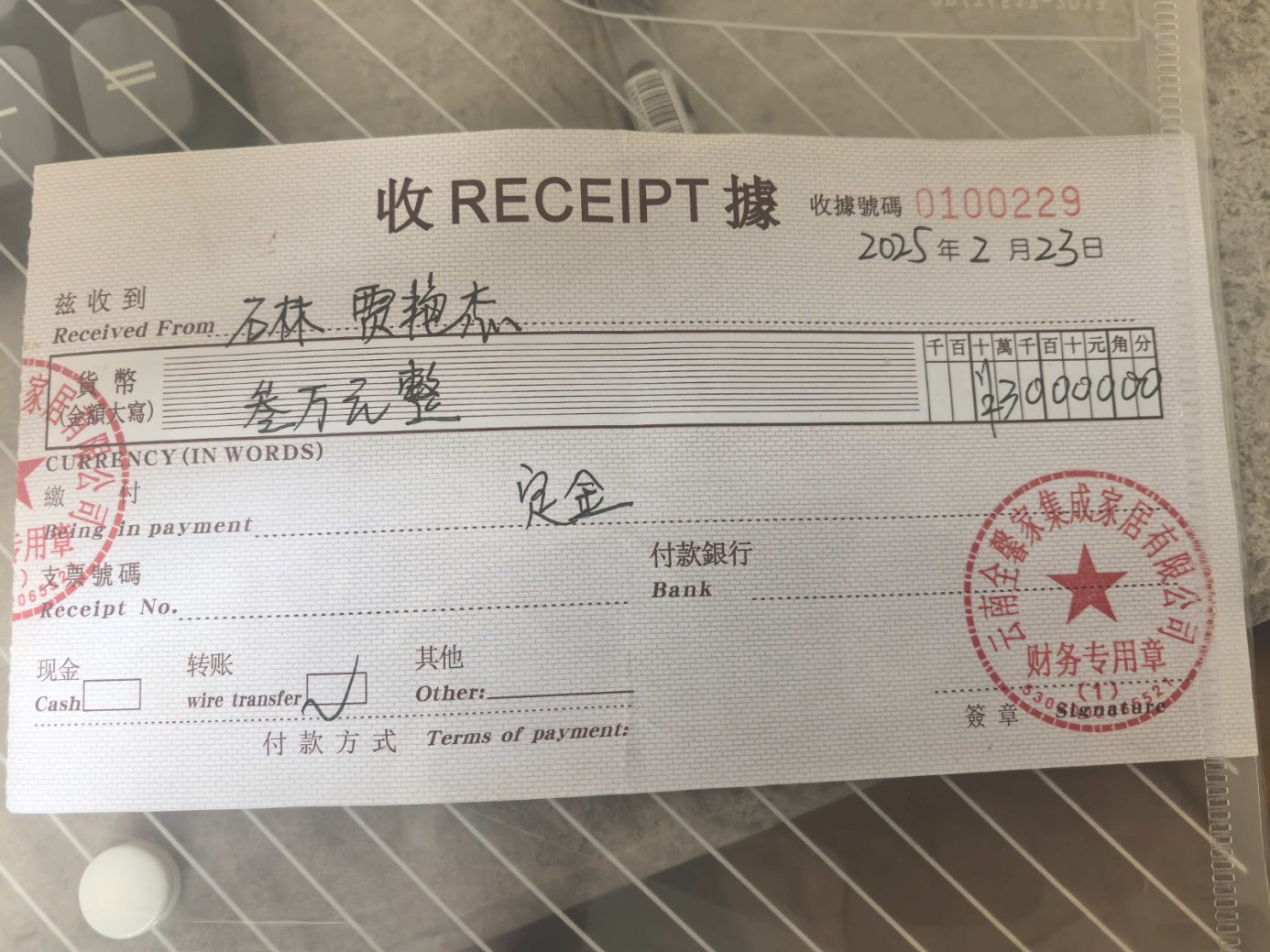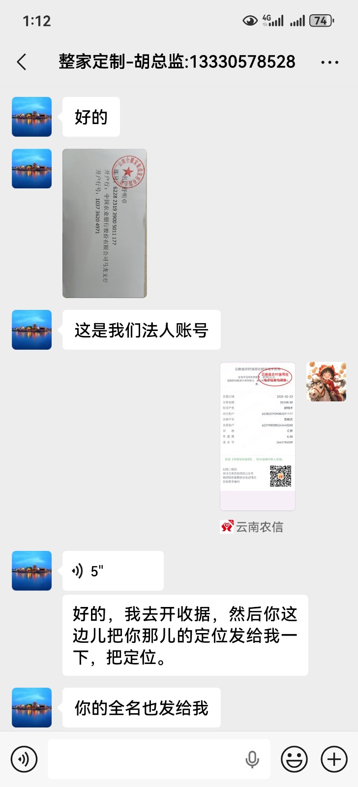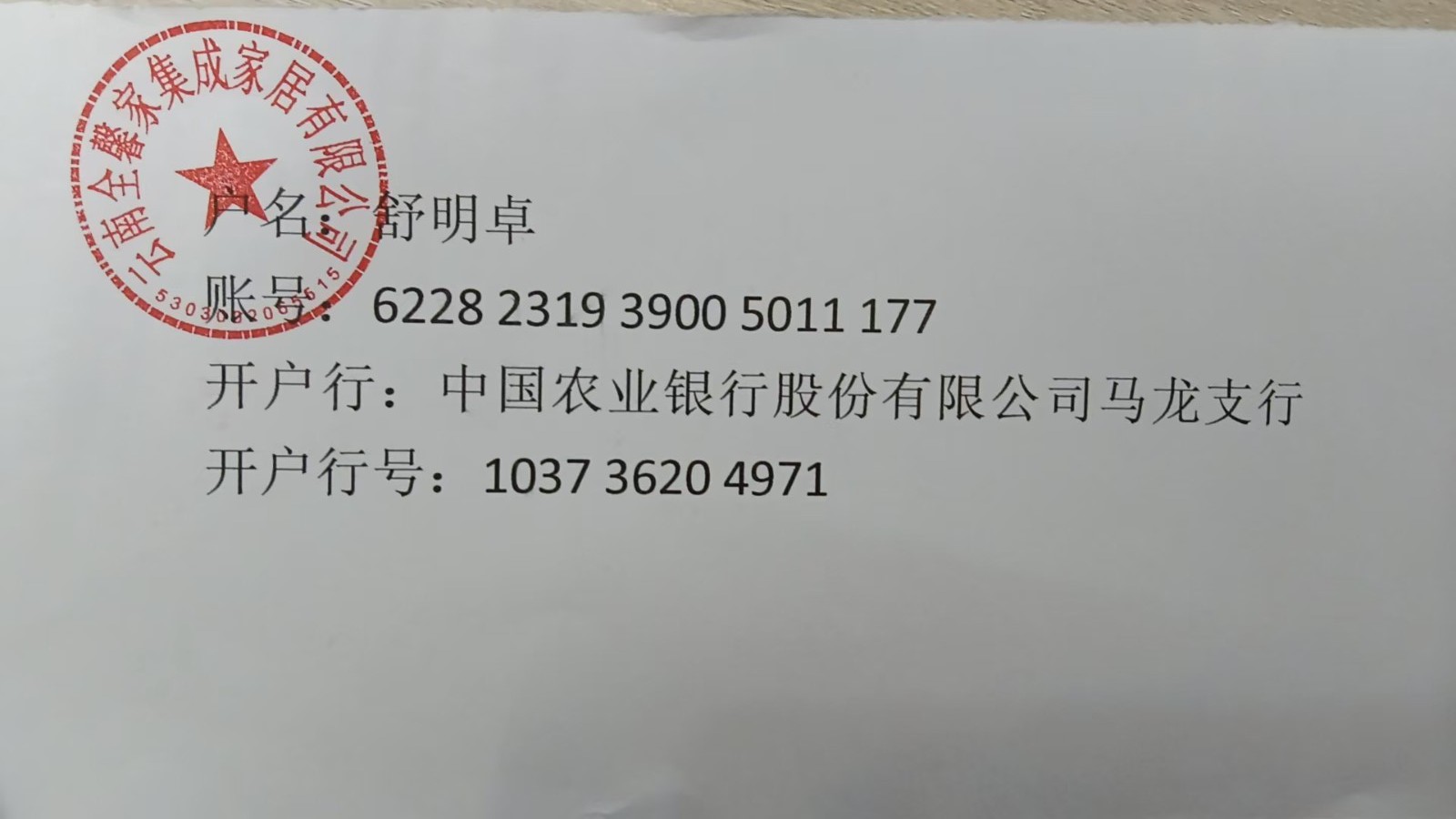 1.交了訂金30000元在云南全鑫家集成家居有限公司的法人舒明卓的私人賬戶上,沒有給我們任何發(fā)票,只給了一張手寫的收據