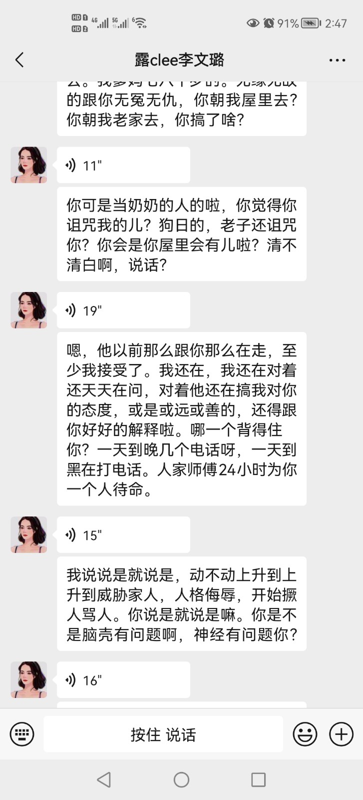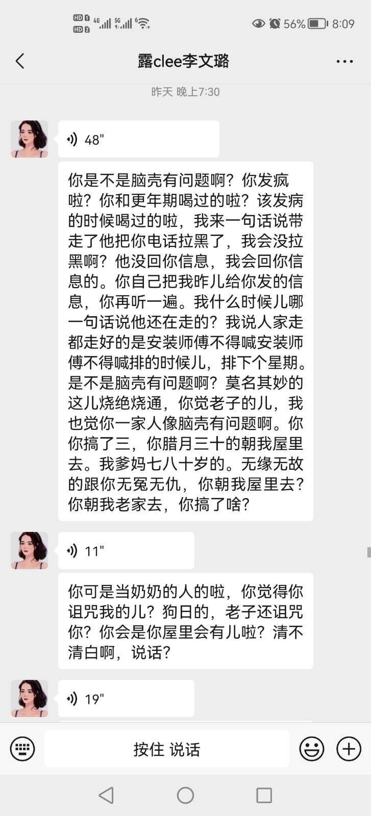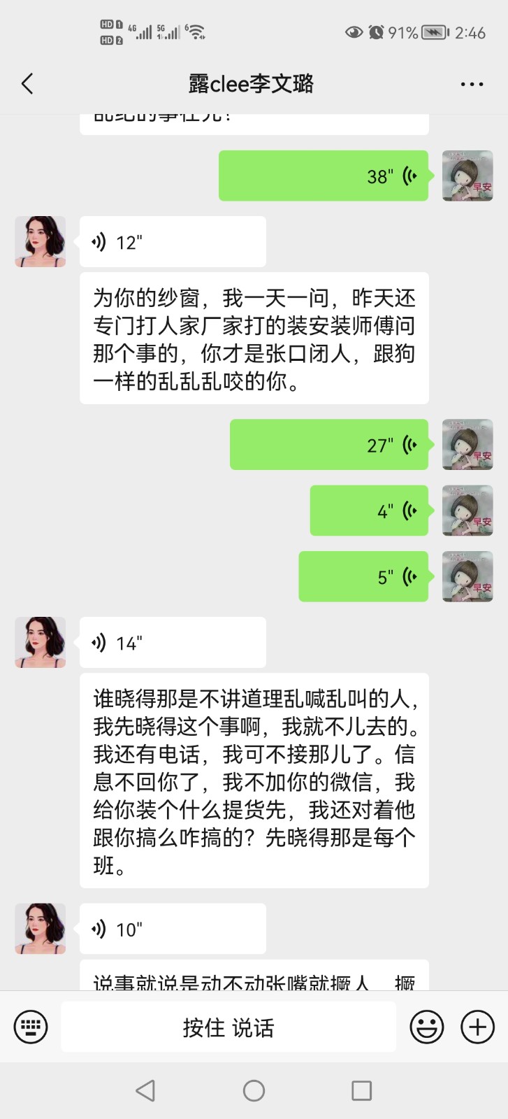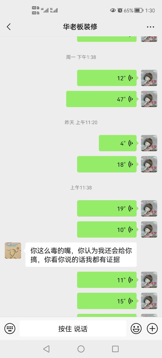 6月9日簽合同的,工期3個月,9月份交房,到現(xiàn)在為止也沒有完工,油漆工刮膩子粉就停工了幾個月,電話不接信息不回,最后我自己耗不起了,接著裝完了,家電進場了才發(fā)現(xiàn)冰箱尺寸不對,打不開門,最后才拆了門框,洗衣機柜子左右做反了,導致洗衣機無法安放,讓他找?guī)煾嫡模狭艘粋€月不搞,還有封陽臺是合同外的,他喊別人來做的,6月23號把整個紗窗錢付了,到如今也沒有拖來安裝,我催問時電話拉黑,信息不回,我就說去他家里找,他馬上打電話威脅謾罵,要讓我住不了,把我主線剪了,己經(jīng)是第三次威脅恐嚇罵人了,他老婆李文璐在微信上罵,說不搞了看我能拿他們咋辦,還說只有9萬元就只能是這種效果,衛(wèi)生間有10公分間隙,