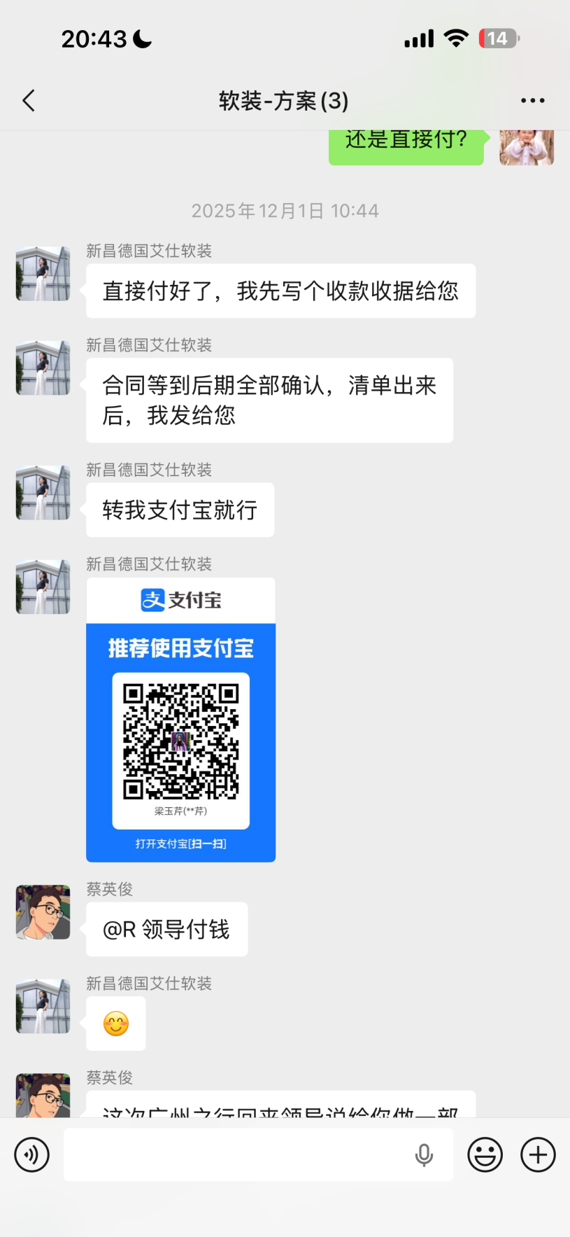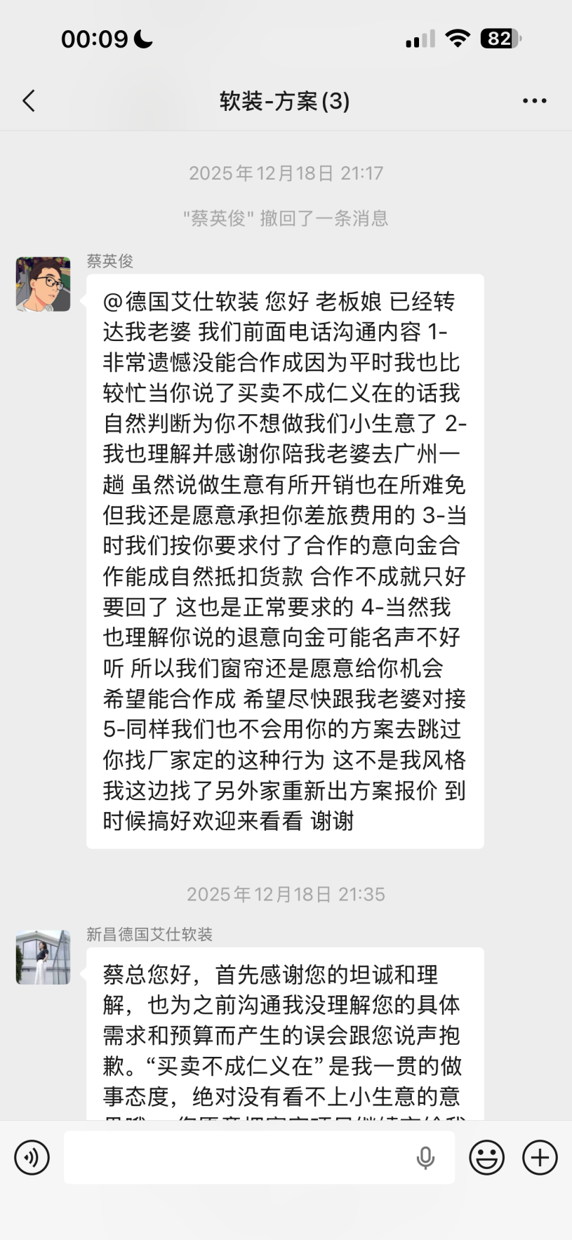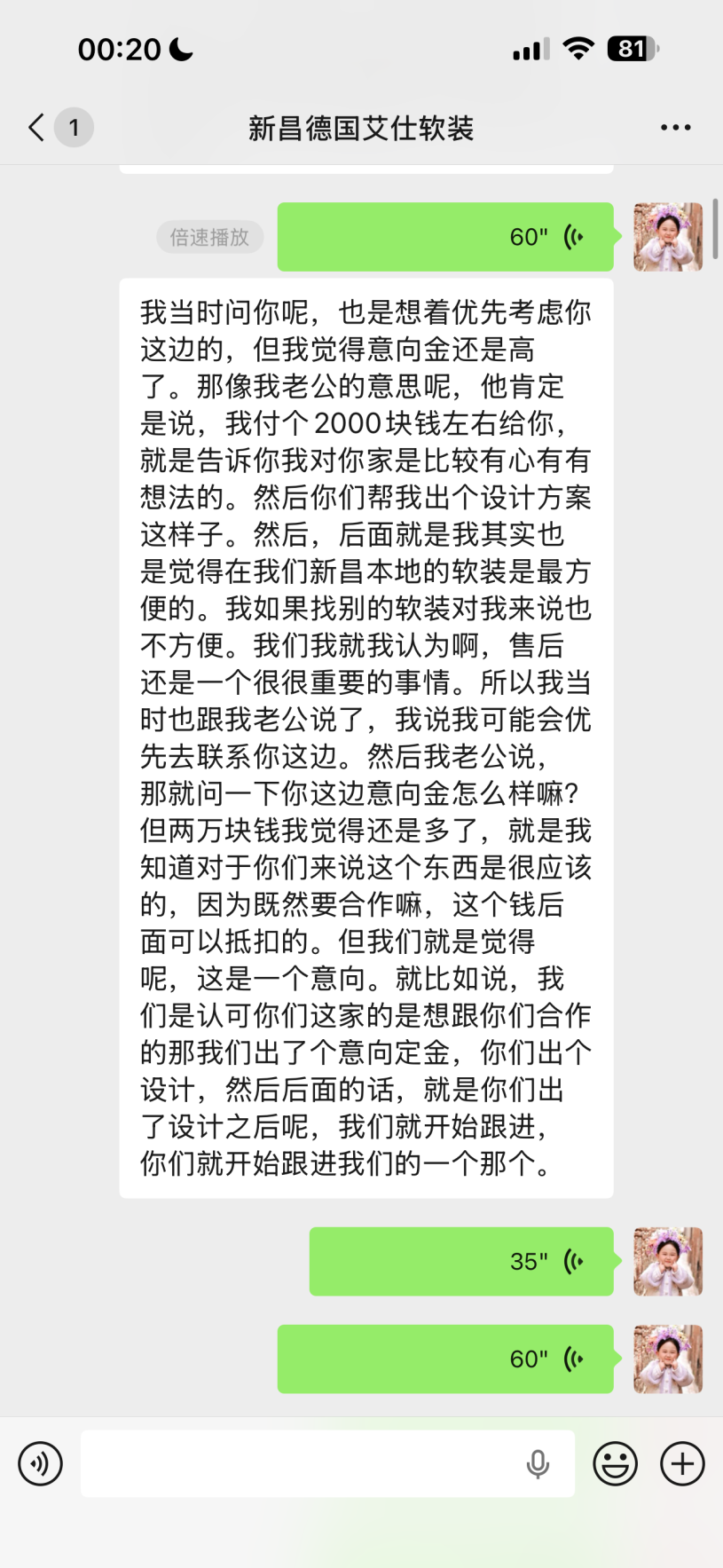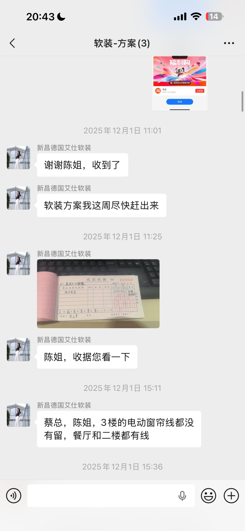 聊著聊著就說認(rèn)可人家了,付了兩萬過去,人家收據(jù)上寫的設(shè)計(jì)定金,后期用于抵扣貨款。我們因?yàn)檫h(yuǎn)程處理的付款的,再加上當(dāng)晚給的收據(jù)的時(shí)候已經(jīng)太晚了我們都睡覺了,沒好好看。1.收據(jù)我們沒簽字,也沒有太注意她寫了啥。2.至今沒有合同給我們,也沒有收據(jù)給我們 3.對(duì)方說自己是因?yàn)樗^的高端定制,沒有明碼標(biāo)價(jià), 所以導(dǎo)致后期報(bào)價(jià)虛高,我們沒談攏,餐桌,沙發(fā),茶桌三件套,同行8w ,她這邊要14萬和17萬兩家讓我們選。不能低了!