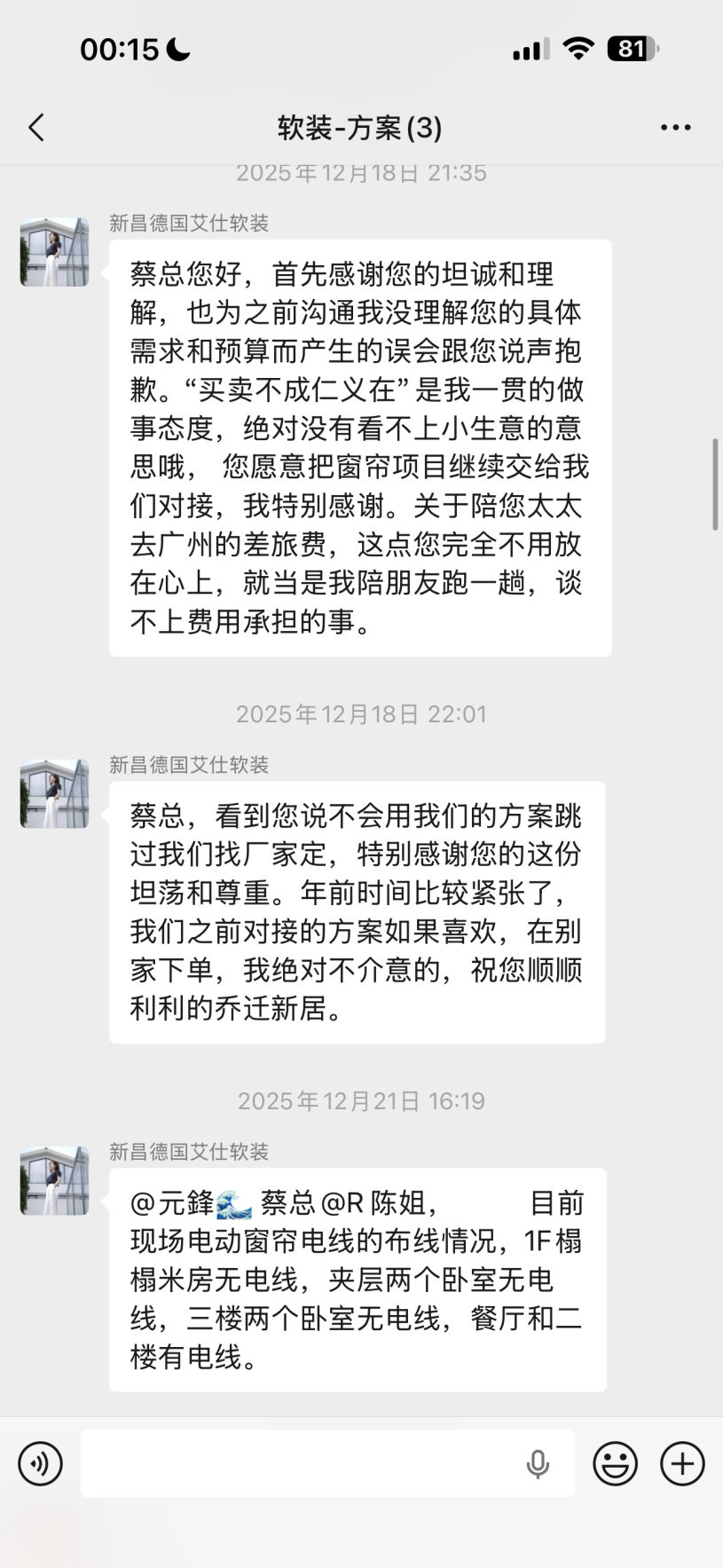 我們不認(rèn)可,不想做了,最開始她還很好說話,讓我們窗簾給她做,我們想著也好,畢竟人情也培養(yǎng)起來了,可以試試看,問題又來了,對(duì)方?jīng)]有設(shè)計(jì)圖,直接讓我們看30*30的布料讓我們從這些小布料上選窗簾,并且報(bào)價(jià)接近五萬。我們一來沒有看上她提供的產(chǎn)品,二來覺得報(bào)價(jià)還是虛高。表示不再合作。