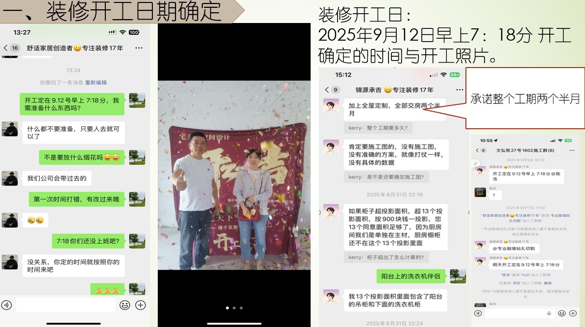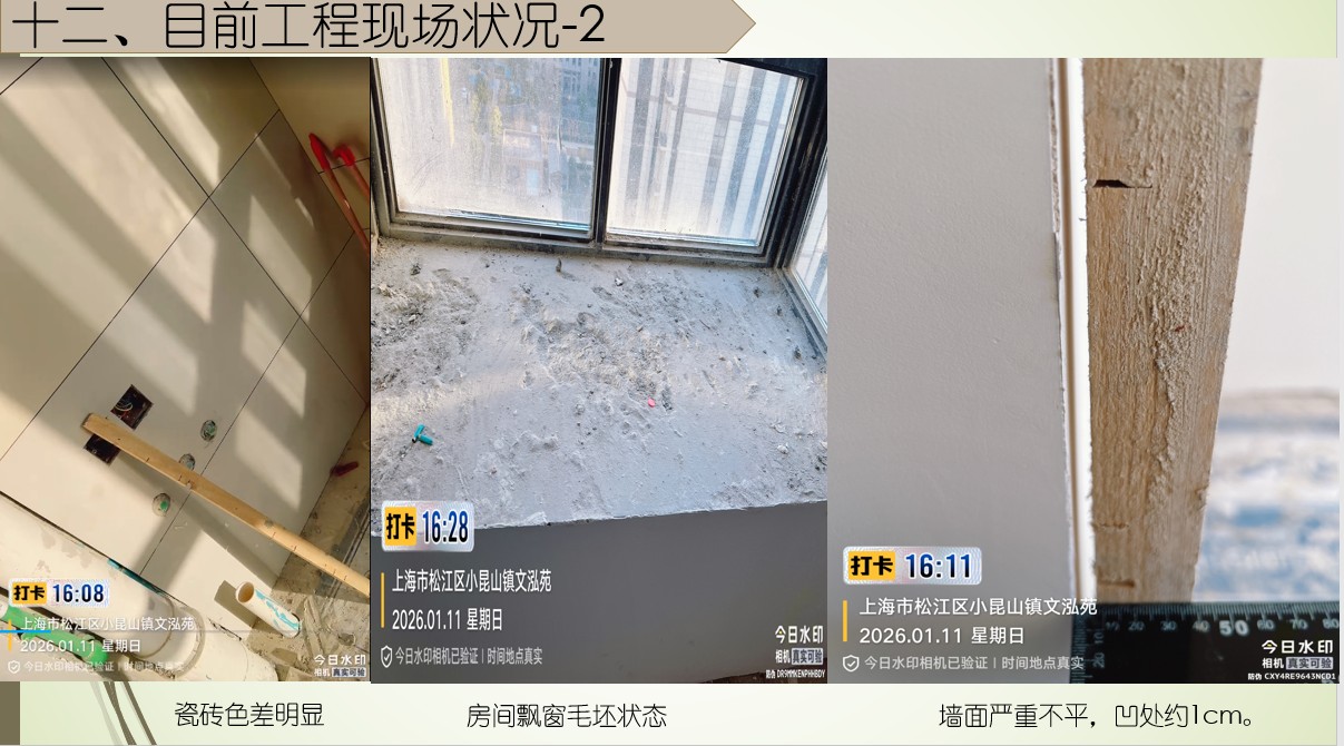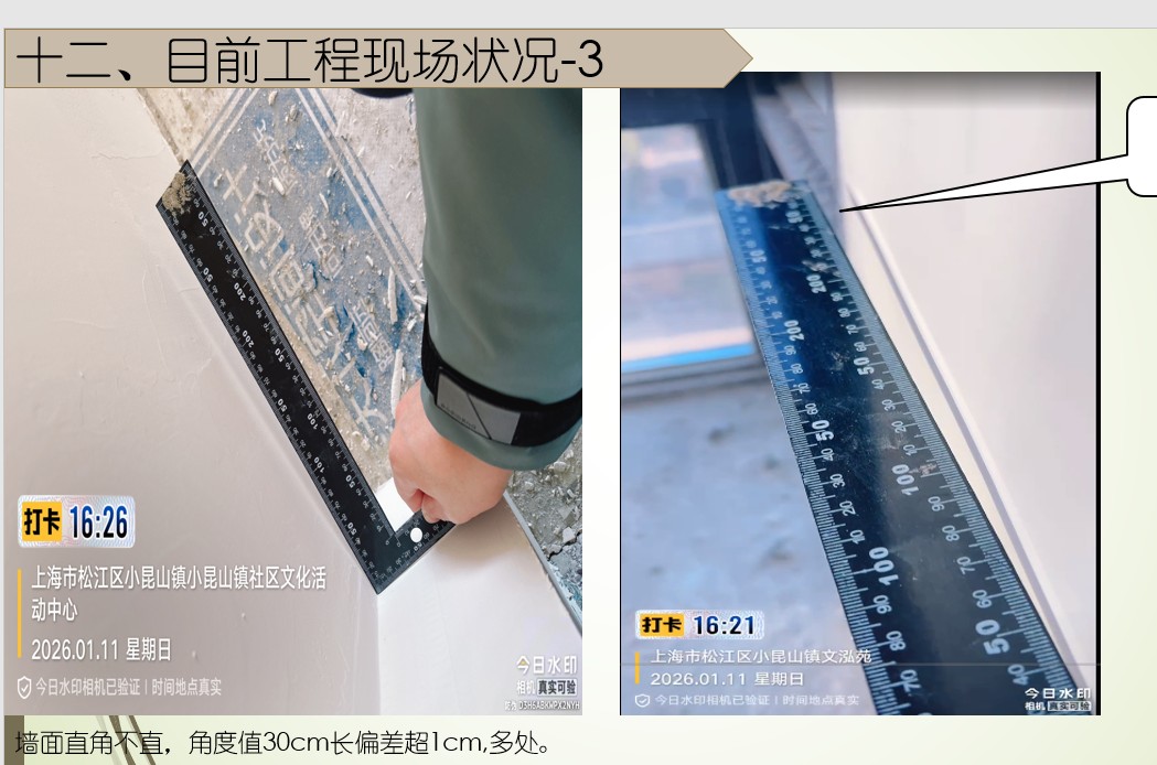 從2025年9月5日簽訂合同到2026年1月28日(約定工期為75天):只施工了水電部分工程,泥瓦貼磚,窗簾盒與吊頂工程,剩下的工程均未完成。工程款已收95%,各階段的施工進(jìn)度都需要業(yè)主不停的催促才進(jìn)行。合同上石膏線為32M,實(shí)際只施工約13M。膩?zhàn)佑泄?,但墻面有很多地方凹陷約1CM,墻內(nèi)外角也不垂直,相差很大。