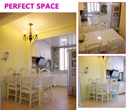 餐廳同廚房相連,廚房做成半開放形式,這樣既可以節(jié)省空間,又符合美式田園的設(shè)計(jì)風(fēng)格。小小的方形餐桌鋪上淡藍(lán)色的碎花桌墊,給餐廳增添了優(yōu)美寧靜同柔黃色的墻漆相互印。