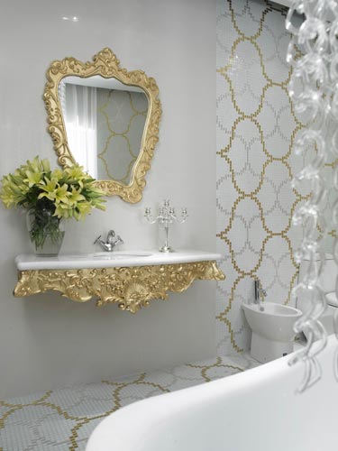 白色的空間配以金色點綴,這樣的復古搭配使得空間內(nèi)金碧輝煌,鏡框和浴室柜上的雕刻也具有濃重的皇族氣息,高貴的整體空間配以多功能化的衛(wèi)浴設(shè)計是古典的華美與現(xiàn)代的簡約的完美結(jié)合。躺在寬敞的浴缸中透過水霧仰望整個空間,就像自己置身于迷霧中的宮殿一般,亦幻亦真。這是高質(zhì)量生活的一種象征。