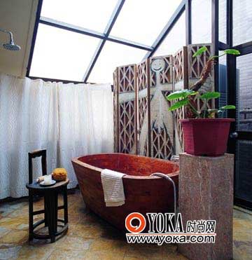 將露臺改成浴室,明亮的天頂采光,放在浴室中間的木質浴盆,粗獷的石材地面以及帶有強烈的民族圖騰式裝飾紋樣的屏風,組合成質樸、渾然天成的原生態(tài)氛圍。這種風格的設計靈感,最初來源于廣袤的非洲大地,原生態(tài)風格的居室出現在都市住宅里,使都市新貴尋覓到返樸歸真的自在空間。