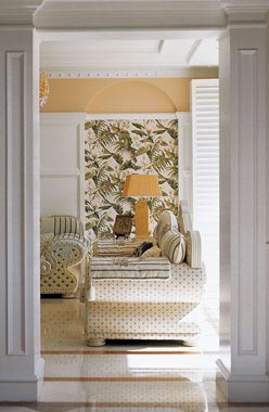用白色的羅馬柱門自然過渡到以白色為主的另一間客廳。植物圖案的壁紙頗具自然性與裝飾感
