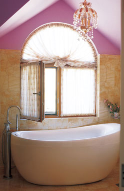 女孩的衛(wèi)浴間,淺紫色的屋頂與層層疊疊的窗簾別具小女生情調(diào)