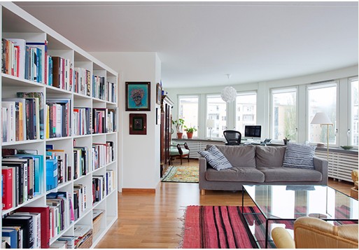 客廳一側(cè)不起眼的純白書架, 塞進上五顏六色的書籍立刻不一樣了起來。