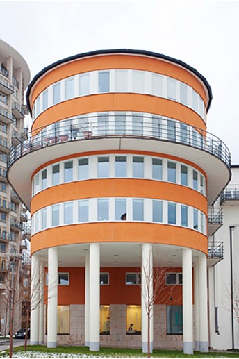 整體建筑設(shè)計,可以看到側(cè)面的陽臺。沿半圓弧排列的16扇圓窗會給你震撼和溫暖。