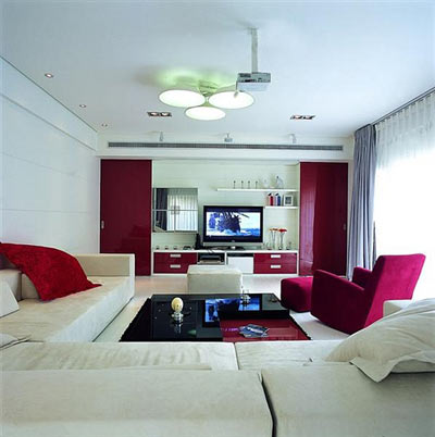 居家環(huán)境中最重要的是要充足陽(yáng)光、新鮮空氣與良好視野的環(huán)境中。該客廳在色彩上運(yùn)用艷紅色彩給淺灰色的空間增添幾分艷麗、明快,整體色調(diào)以純度較高的顏色為主,純度高的顏色透氣感比較好。像橙色、艷紅、藍(lán)色等顏色,讓人有動(dòng)感十足的感覺。