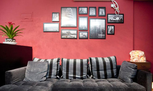 灰色的沙發(fā)和黑框相冊遇上紅色背景墻,熱情中帶著一絲沉著,加上植物的小小綠色點(diǎn)綴,營造出強(qiáng)烈的視覺效果。