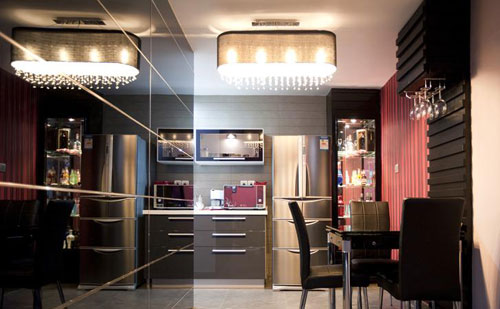 餐廳的一面墻用反光內(nèi)墻磚裝修,使空間放大,另一面紅色的墻紙暖意十足。水晶吊燈映照在反光墻面上,效果很贊!整個(gè)廚房色彩搭配及設(shè)計(jì)勝過客廳。