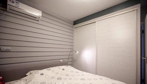 臥室墻面采用白色橫條紋,層次感十足。整個(gè)色系以灰色為主,加上燈光照明顯得居室空間很有質(zhì)感。