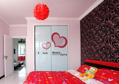 紅色為主色調(diào),充滿濃濃的喜慶和浪漫氣氛。如果你稍微留意,就會發(fā)現(xiàn)案例中到處有男女主人愛的表達(dá),無論是心型的符號,還是英文的表達(dá),都讓這個(gè)家充塞著兩人的愛意,這是兩人用愛營造的小屋。