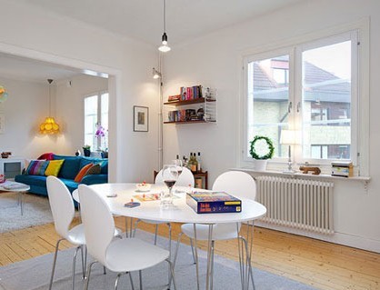 餐廳與客廳打通,客廳明艷的時(shí)尚色彩搭配。襯托出線條洗練的木質(zhì)餐桌和座椅,頗具北歐風(fēng)情,也讓整個(gè)餐廳看起來(lái)更加簡(jiǎn)潔恬淡。桌上暖意色調(diào)的餐具,和亮麗的沙發(fā)區(qū)相映成趣,整個(gè)空間被拉進(jìn)一個(gè)活潑溫馨的氛圍中。