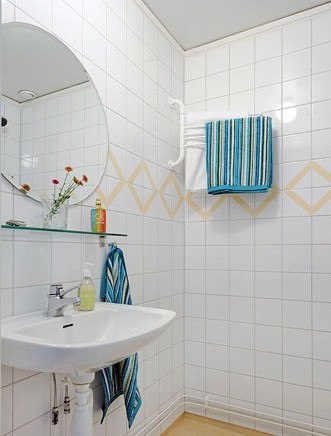 衛(wèi)浴空間的設(shè)計(jì)簡(jiǎn)潔而明快,體現(xiàn)了現(xiàn)代人的品味。清新的藍(lán)色、黃色點(diǎn)綴呈現(xiàn)出清爽明凈感,小部分花磚的墻面拼貼在細(xì)膩中展現(xiàn)出不凡的品質(zhì)感,營(yíng)造出純凈的自然氛圍。擱架的處理提供了良好的收納裝置,是裝飾,也是實(shí)用家品。讓空間顯得非常舒適。