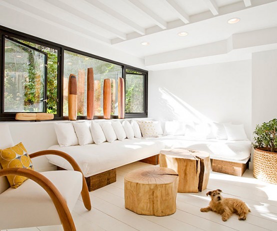 類似年輪的樹(shù)樁茶幾是空上簡(jiǎn)約客廳的一個(gè)特色,布藝沙發(fā),藤框盆栽……窗外的陽(yáng)光灑時(shí)客廳里,這樣的居家舒適自然。