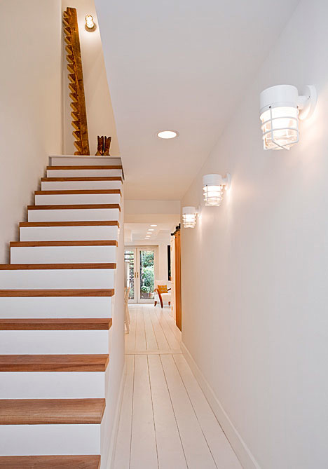 上樓的樓梯臺(tái)面依然用實(shí)木來(lái)做,赤腳走在上面也不會(huì)有水泥瓷磚的冰涼感。做這個(gè)樓梯之前,參考過(guò)很多其它復(fù)式躍層的樣子,但是都沒(méi)有找到合適的,最后還是自己決定另出新招吧。