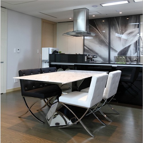 餐廳區(qū)域又是黑白銀的搭配,和家居設(shè)計保持連貫性和統(tǒng)一性。用大理石材料的白色飯桌,體現(xiàn)家居的奢華,低調(diào)又有格調(diào)。以黑白表情呈現(xiàn)開放餐廳的簡約意象,與全屋設(shè)計同元素的材質(zhì)呈現(xiàn)一氣呵成的連貫感受。