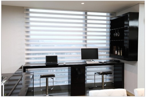 餐廳的另一邊的休閑間,品嘗美酒、玩電腦、從落地玻璃窗欣賞風景,在忙碌的都市生活中忙里偷閑。白色的百葉窗、白色的墻壁、黑色的酒柜,再搭配窗外的風景,明亮透澈的設(shè)計,使人心境舒暢。