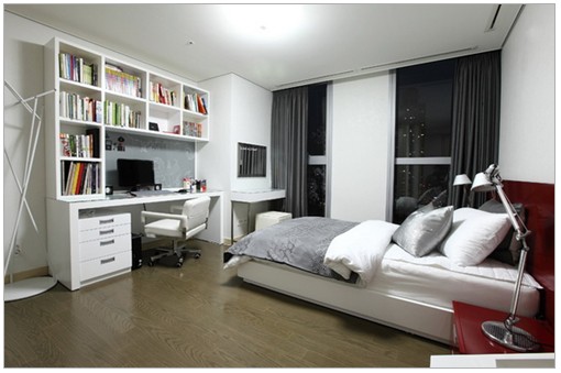 銀色的抱枕、灰色的被套、深灰色的窗簾使寢室和客廳的設(shè)計保持連貫性。搭配酒紅色的床頭板,透露出一絲女性的性感特色。臥室內(nèi)書柜和書桌的二合一,節(jié)省空間,也讓生活更加便利。書柜旁邊的衣帽架,線條設(shè)計特別,為空間增添了另外一種的線條層次,同時和床頭的不規(guī)則書柜相互輝映,相互呼應(yīng)。
