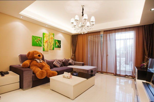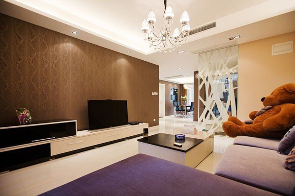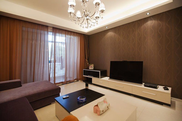 客廳的墻面,窗簾及布藝沙發(fā)以咖啡色及紫色系列。讓充滿(mǎn)現(xiàn)代感的簡(jiǎn)約空間里多了一些浪漫溫馨。