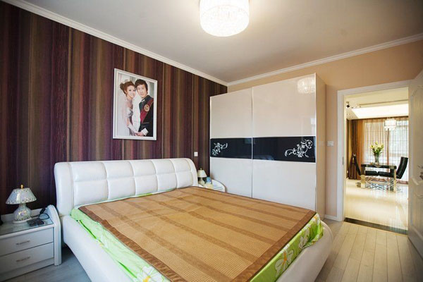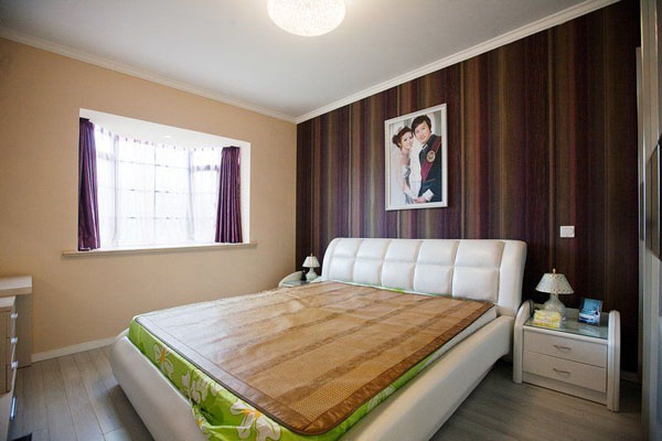 臥室里軟裝還沒(méi)有進(jìn)場(chǎng),我們就先來(lái)拍一些圖。臥室的背景墻用堅(jiān)條紋的墻紙,衣服是宜家買(mǎi)的,床頭柜也一樣,這個(gè)比木工做要美觀許多。