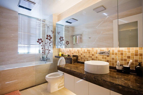 衛(wèi)生間里裝修以現(xiàn)代風(fēng)主,咖啡的大理石臺(tái)面襯托著潔白的臺(tái)盆,浴缸與馬桶以一扇強(qiáng)化玻璃做形式的隔開(kāi)。