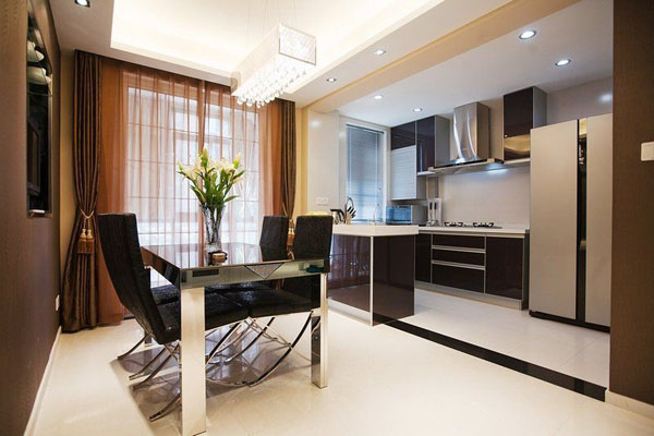 餐廳與廚房相對(duì),廚房間采用的半開(kāi)放式的。房東說(shuō)他們都不是很喜歡油煙,家里做飯也少,這樣就足夠了、