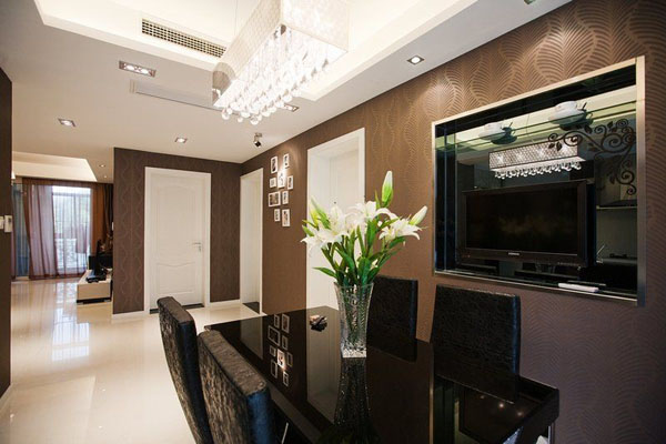 客廳與餐廳之間制作的是樣式美觀的鏤空隔斷,不影響空間采光亦能增加裝飾度,何樂(lè)而不為呢。