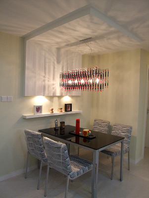 整個餐廳中最出彩的無疑是那款吊燈營造出的夢幻效果,由眾多紅點黑條組成的這款吊燈有一種很民族的感覺,像少數(shù)民族的服裝,最奇妙的是開了燈之后,燈光會將燈本身的影子倒映在白色天花板上,十分地燦爛旖旎。