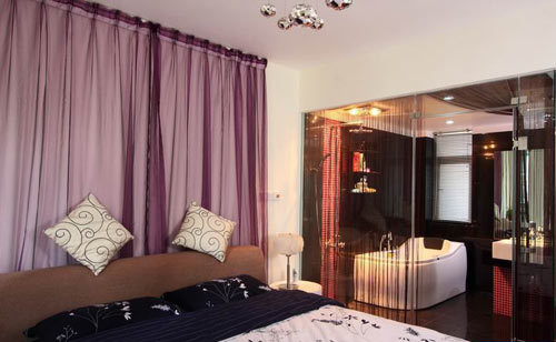 縱觀整個(gè)臥室,無論是紫色的簾子還是衛(wèi)浴間紅色的馬賽克,在色彩上皆與衛(wèi)生間純白的潔具與黑色背景墻相協(xié)調(diào)。看上去舒服、大氣,不失溫馨。