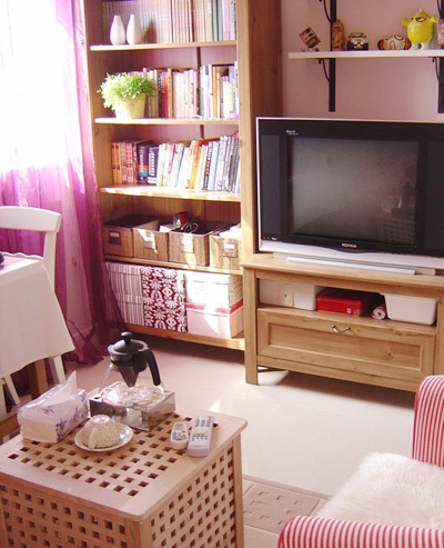 小客廳里各個(gè)角落里都充分利用了,做為婚房,顏色都是偏向暖色調(diào),也與韓式風(fēng)格相互應(yīng)。小空間里電視柜,書架,沙發(fā)茶幾都是一樣不少的,雖然空間面積不大,但是依然非常豐富,淡淡的居家溫馨感。