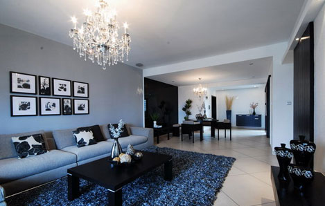 客廳:窗簾、地毯與整體格調(diào)一致的灰黑色,水晶燈給人奢華的感覺(jué)??蛷d與餐廳相連,視覺(jué)上顯得很大。