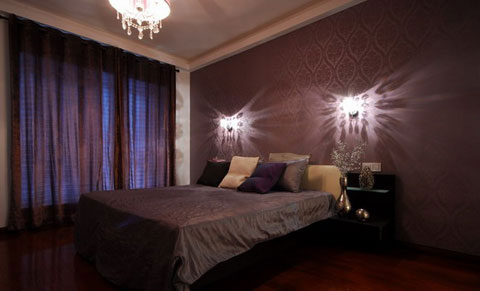 深紫色的臥室在水晶燈的照應(yīng)下十分夢(mèng)幻,整體效果奢華時(shí)尚。