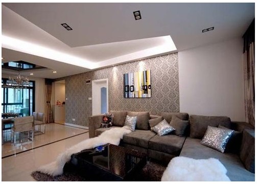 玄關(guān)處壁紙一直延伸到客廳沙發(fā)背景墻。客廳棕色的沙發(fā)與墻紙色調(diào)一致。白色皮草及銀色靠枕,第一時間跳出大家的視線,有種小華麗的感覺。餐廳與客廳之間用了一圈?;u走邊,區(qū)分了客廳和餐廳的空間。