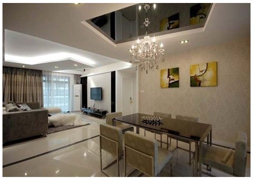 餐廳的全景,白色水晶吊燈與黑色烤漆吊頂?shù)慕^美搭配,貌似水晶燈猶如出淤泥的蓮花。很有質(zhì)感的黑色鏡面吊頂也可反射出兩個水晶燈,為餐廳區(qū)域增加了亮度。餐桌背景墻的兩幅黃色油畫,在棕色中起到點金之筆,使整個空間不那么沉悶。