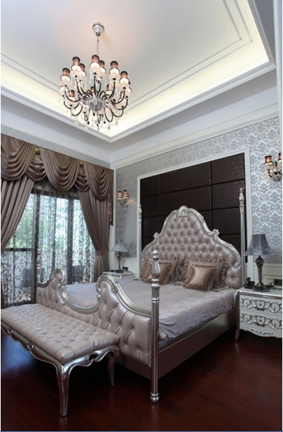 主臥:主臥大面積搭配銀色墻布,再間以近色的家具等,雍容大方,舒適奢華,突顯主人年輕時(shí)尚華貴的品味。而父母房、客房,兩種略顯厚重顏色搭配,亦是另外一種尊貴氣氛。