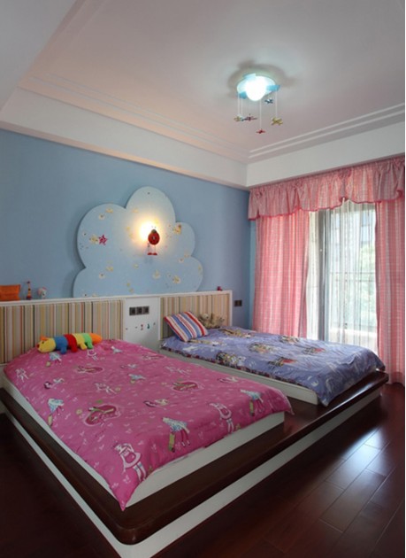 兒童房:兒童房設(shè)計(jì)體現(xiàn)其人性化設(shè)計(jì)的一面。地面略抬高,以形成榻榻米式雙人床。直角處都進(jìn)行圓滑處理,以增加其安全性。兩張小床放在一起,以使孩子之間的活動更加方便。墻面背景的造型既色彩豐富,又飽含童趣。