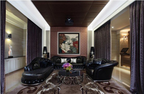 影音室:主人的另外重要活動空間是影音室,其中一襲客餐廳時(shí)尚特色,但顯得更時(shí)尚,最明顯的特征是使用紫色絨布作為隔斷,內(nèi)置酷黑皮質(zhì)沙發(fā),軟包吊頂?shù)取?/p>