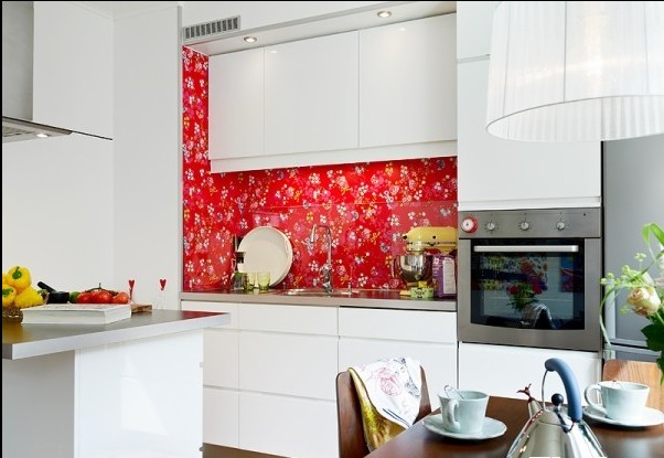 這個不大的中戶型空間里,廚房及餐桌做在了一個空間里。開放式的廚房,通體的單一色彩,因背景墻面的那抹艷紅而特別出彩。櫥柜的上方為了照明方便做了一個用來安裝射燈的小吊頂。
