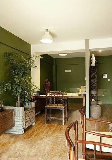 橄欖綠的墻面和樸質(zhì)的木地板相連,使得空間更具有生命力, 同樣也具有感染力。