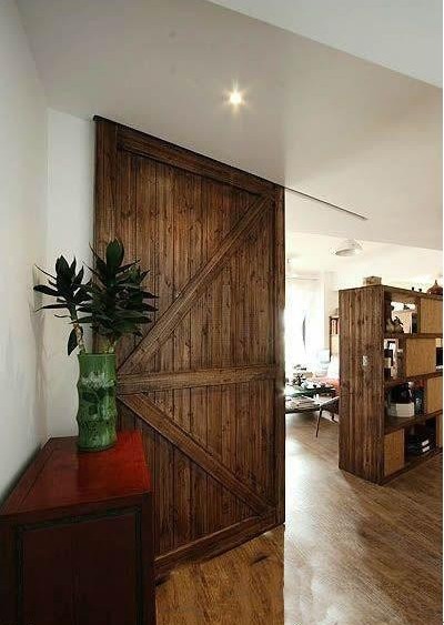 作舊處理的田園風(fēng)格實木門。與客廳背景墻的書架風(fēng)格一致,醞釀著一種古樸帶有掩飾性的氛圍。