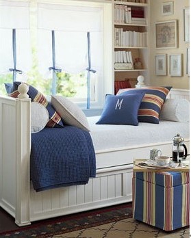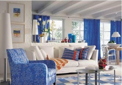 以地中海地區(qū)的地域劃分,地中海風(fēng)格大致有三個典型的顏色搭配藍與白:從西班牙、摩洛哥海岸延伸到地中海東岸的希臘,西班牙那蔚藍海岸與白色沙灘、希臘的白色村莊在碧海藍天下閃閃發(fā)光,而村莊、沙灘和碧海、藍天連成一片,一切就像在夢中一樣。就連門框、樓梯扶手、窗戶、椅面、椅腿都會做成藍與白的配色,加上混著貝殼、細(xì)沙的墻面,小鵝卵石地,拼貼的馬賽克,金、銀、鐵的器皿,都將藍與白不同程度的對比與組合發(fā)揮到極致。