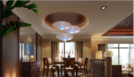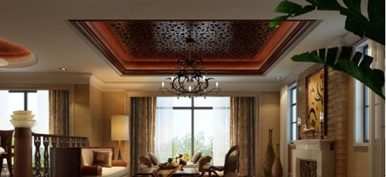 吊頂面采用新古典與新東方的元素,亮麗的木色,有序排例的圖案成為客廳華麗的亮點(diǎn);
