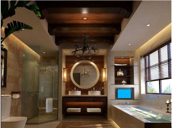 衛(wèi)生間的設(shè)計(jì)則把新東方的元素通過原木吊頂引入,并以此為中軸點(diǎn)納入過度空間;雙人面盆,圓形的裝飾鏡面成為視覺中心,讓人頓生駐足整容的歇息站;